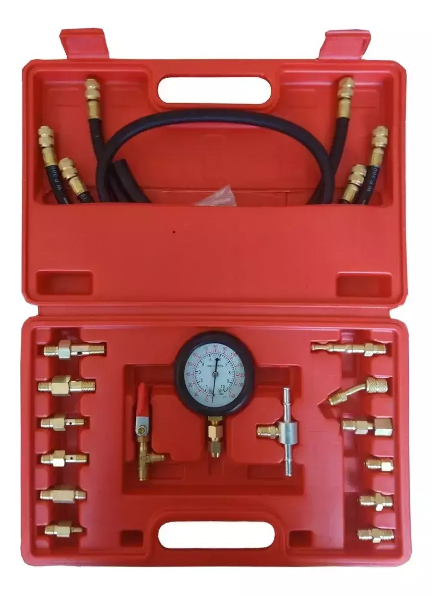 El Manómetro de Presión de Nafta Automotriz Eurotech (19 Pzs) es una herramienta profesional diseñada para la medición de presión en sistemas de inyección de combustible. Su manómetro de fácil lectura permite visualizar valores en PSI y sistema métrico, garantizando precisión en el diagnóstico de fallas.