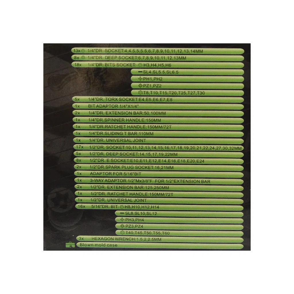 El Juego de Bocallaves Riddle Pro 108 Pcs es un kit completo y versátil, diseñado para trabajos mecánicos profesionales y de mantenimiento. Con encastres de 1/4” y 1/2”, incluye tubos, puntas, criques y accesorios que garantizan precisión, durabilidad y practicidad en cualquier tarea.