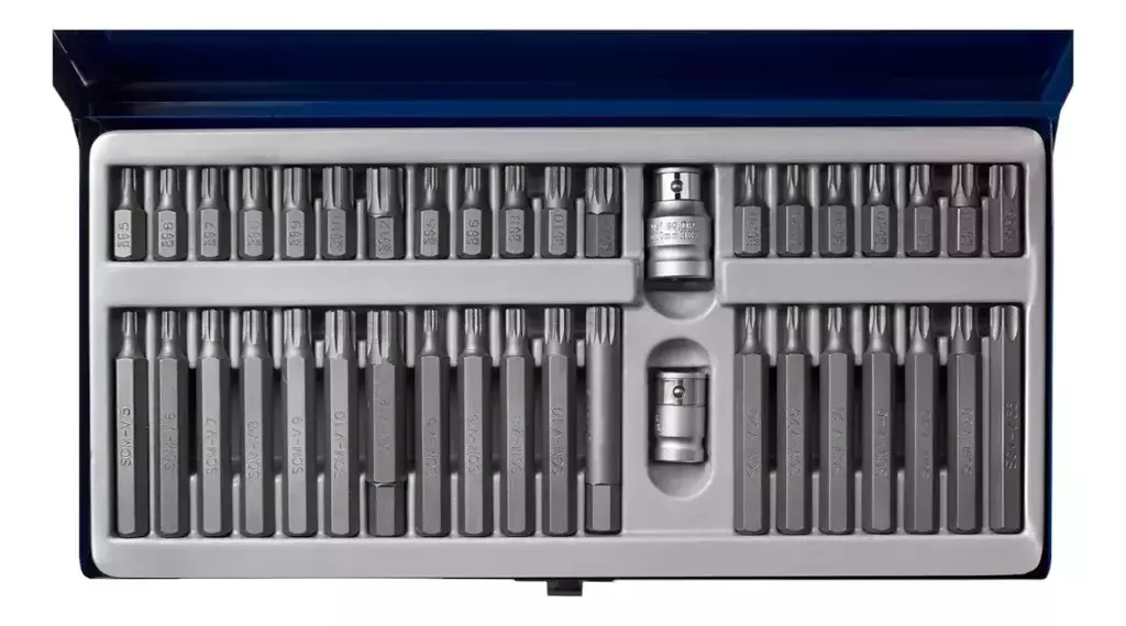 El Juego de Puntas Torx, Ribe y Multiestría Bremen (40 Pzs) es un set profesional fabricado en acero S2 de alta resistencia, ideal para trabajos exigentes en mecánica, mantenimiento automotriz e industrial. Presentado en una caja metálica compacta y resistente, ofrece orden y durabilidad en el guardado.