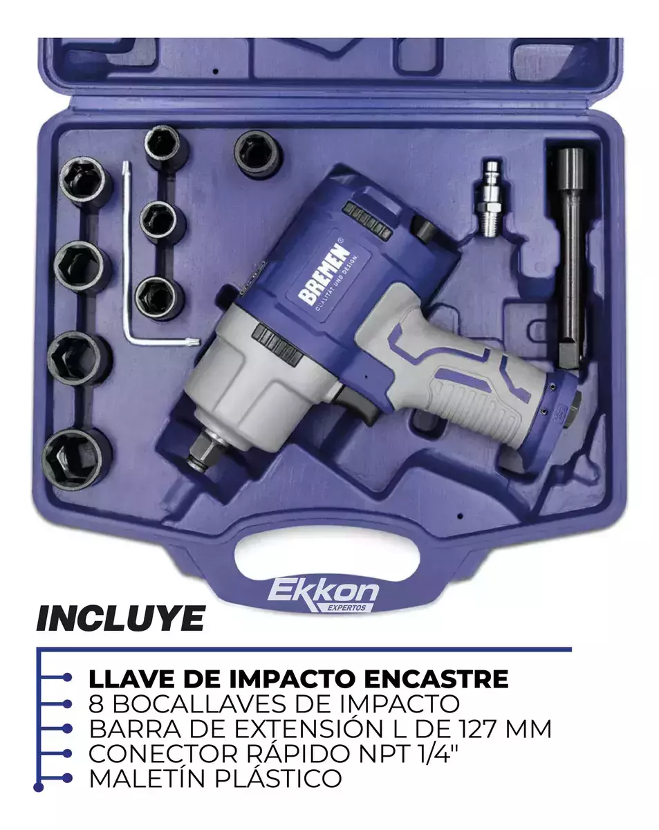 La Llave de Impacto Bremen 1/2" Composite es una herramienta profesional diseñada para ofrecer máxima potencia con menor peso, ideal para uso intensivo en talleres mecánicos, gomerías e industrias.