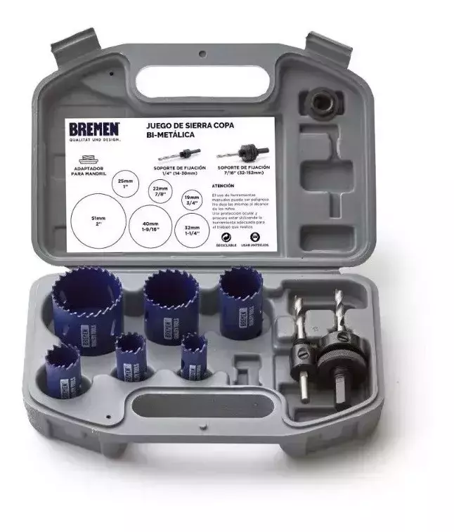 El Kit Bremen de 9 piezas incluye una selección de sierras copa de acero M42 de alta calidad, diseñadas para cortes precisos y duraderos en múltiples materiales.