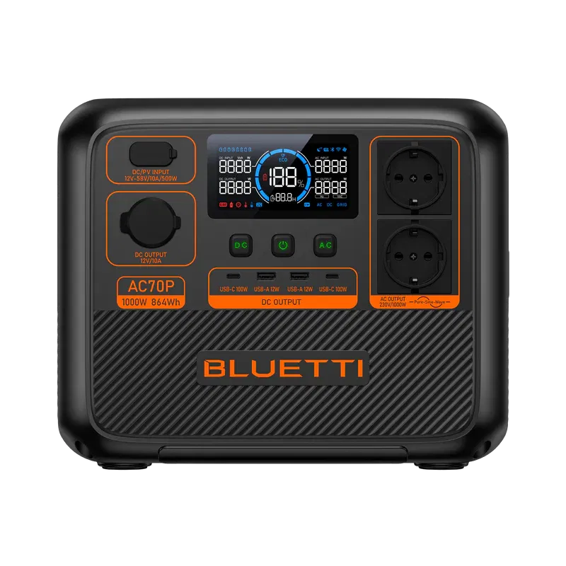 La BLUETTI AC70P es una estación de energía portátil potente, compacta y confiable, pensada tanto para acampadas como para respaldo energético en el hogar. Con 1000W de potencia nominal (hasta 2000W en picos resistivos) y batería LiFePO₄ de larga duración, garantiza energía estable cuando más la necesitás.