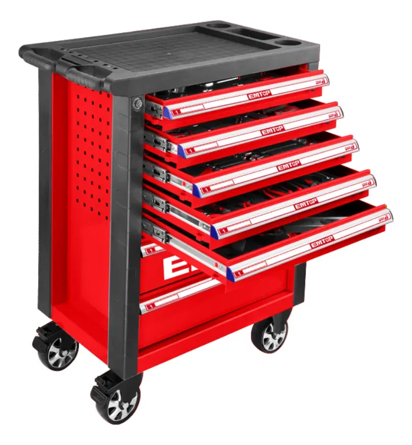 Juego de carro de herramientas de 328 piezas EMTOP EHTS03281 Características del gabinete: - Con cajones de 7 piezas - Tamaño total: 765 x 465 x 812mm - Tamaño total con ruedas: 765x465x976 mm - Tamaño de las ruedas: 5 "* 2" - Espesor del gabinete: 0,8-1,0 mm - Espesor del cajón: 0,7 mm. - Con cajón de 5 piezas 536x410x74,5 mm - Con cajón de 2 uds 536x410x153,5mm - 5 ganchos de hierro (para herramientas para colgar).