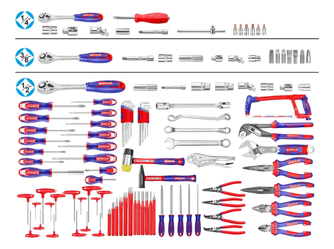 - 1 U. Llave de Criquet 1/4" - 13 U. de tubos de 1/4" 4 - 4,5 - 5 - 5,5 - 6 - 7 - 8 - 9 - 10 - 11 - 12 - 13 - 14 - 24 brocas de 1/4" x 32 (L): hexagonal: 3 - 4 - 5 - 6 - 7 - 8 - 10 mm, estrella: T8-T10-T15-T20-T25-T27-T30-T40 SL:4-5,5. -7mm,PH1,PH2,PH3,PZ1,PZ2,PZ3. - 8 U. Enchufe profundo de 1/4 " 50mm (L): 6 - 7 - 8 - 9 - 10 - 11 - 12-13mm - 6 casquillos de estrella de 1/4": E4 - E5 - E6 - E7 - E8 - E10. - 2 barras de extensión: 1/4". x 50 mm, 1/4". x 100 mm - 1 mango giratorio: 1/4 x 150 mm. - 1 barra flexible de extensión: 1/4 x 150 mm. - 1 junta universal de 1/4 pulgadas. - 1 barra deslizante en "T": 1/4 x 114 mm. - 1 adaptador de tres vías de 1/4 pulgadas: 3/8 pulgadas (F) x 1/4 pulgadas (M). - 1 soporte para brocas: 1/4 x 6,35 mm. - 40 Uds. Brocas de 6,35*25mm(L): T5 - T6 - T7 - T8 - T9 - T10 - T15 - T20 - T25 - T30 - PH1 - PH2 - PH2 - PH3 - PH4 - PZ1 - PZ2 - PZ2 - PZ3 - PZ4 -SL3-SL3-SL4-SL4-SL5-SL5.5-SL6-SL6.5-SL7-SL7-H2-H3-H3-H4-H4-H5-H5-H6-H7-H7 - 1 Uds vástago magnético: 6,35mm * 100mm - 1 U. Llave criquet de 1/2" - 1 junta universal de 1/2 pulgadas. - 19 Uds. Enchufe de 1/2 ": 8 - 10 - 11 - 12 - 13 - 14 - 15 - 16 - 17 - 18 - 19 - 20 - 21 - 22 - 23 - 24 - 27 - 30 - 32mm - 4 piezas de 1/2 "DR 77 mm (L) Vaso profundo: 14-15-17-19 mm - 5 uds 1/2 "enchufe de estrella: E10 12 14 16 20 - 2 casquillos para bujías: 1/2".16 mm -21 mm. - 1 barra en T deslizante de 1/2 x 250 mm. - 2 barras de extensión: 1/2". x 100 mm, 1/2". x 250 mm - 3 brocas de 1/2 x 58 mm (largo): T55, T60, T70. - 1 adaptador de tres vías de 1/2 pulgadas: 3/8 pulgadas (F) x 1/2 (M). - 32 Uds. Brocas de 8x30mm(L): PH3, PH4, PZ3, PZ4, H7, H8, H10, H12, H14, SL5, SL6, SL6.5, SL8, T20, T25, T27, T30, T35, T40, T45, T50, T55, T27H, T30H, T35H, T40H, T45H, T50H, M5, M6, M8, M10 - 1 soporte para brocas: 1/2 x 8 mm. - 13 Uds. tubos hexagonales de 3/8": 10,11,12,13,14,15,16,17,18,19,21,22,24mm - 9 tubos hexagonales de 3/8" de profundidad: 10,11,12,13,14,15,16,17,19 mm. - 7 casquillos de estrella de 3/8": E10, E11, E12, E14, E16, E18, E20. - 1 llave de criquet: 3/8" - 2 barras de extensión de 3/8": 75 mm (3"), 150 mm (6") - 1 U. Junta Universal: 3/8" - 1 adaptador de tres vías de 3/8 pulgadas: 3/8 pulgadas (F) x 3/8 (M). - 14Uds. de destornilladores: SL3*75, SL4*100, SL5.5*100, SL6.5*38, SL6.5*125, SL6.5*150, SL8*200, PH0*75, PH1*75, PH1*100, PH2*38, PH2*125, PH2*150, PH3*200 - 8 llaves hexagonales con mango en T: 2 x 100 mm, 2,5 x 100 mm, 3 x 100 mm, 4 x 150 mm, 5 x 150 mm, 6 x 150 mm, 8 x 200 mm, 10 x 200 mm. - Llave Torx con mango en T de 8 Uds.: T10X100mm,T15X100mm,T20X100mm,T25X150mm,T30X150mm,T40X150mm,T45X200mm,T50X200mm - 17 Llaves combinada: 6, 7, 8, 9, 10, 11, 12, 13, 14, 15, 16, 17, 18, 19, 21, 22, 24 - 5 uds. Llave para tuercas abocinadas: 8*9,10*11, 12*13, 14*15, 17*19 - 5 uds. Llave de vaso doble flexible: 8*10,10*12,12*14,14*17,17*19 - 12 Uds. Llave de estrella acodada: 6*7,8*9,10*11,12*13,14*15,16*17,18*19,20*22,21*23,24*27,25*28,30 *32. - Llave hexagonal de 9 piezas: 1,5,2,2,5,3,4,5,6,8,10 - Llave Trox de 9 piezas: T10,T15,T20,T2,T27,T30,T40,T45,T50 - 1 llave de bloqueo de mandíbula curva de 10.0 in. - 1 martillo de goma y plástico de 40 mm. - 1 Pico de loro de 10" - 1 Pinza de punta larga de alto apalancamiento de 8 " - 1 Pinza de punta curvada de alto apalancamiento de 8.0 in. - 1 Pinza combinados de alto apalancamiento de 8.0 in. - 1 Alicates de corte diagonal de alto apalancamiento de 7 pulgadas. - 4 Alicates para anillos. - 1 martillo maquinista de 300 g. - 1 llave francesa de 10 pulgadas, - 1 marco de sierra para metales. - 3 piezas de cincel frío: 10x142mm 13x152mm 16x172mm - Punzón de 6 piezas: 1,5x152 mm 3x152 mm 4x152 mm 5x152 6x152 mm 8x152 mm - 1 punzón cónico: 2x140 mm (3/32 "x 5-1/2") - Punzón central de 2 piezas: 6x102 mm (1/14 "x4") 8x115 mm (5/16 "x 4-1/2") - Juego de limas de acero de 5 piezas: - Lima de acero plana 1 pieza. - Lima de acero media caña 1ud - Lima redonda de acero 1 pieza. - Lima de acero triangular 1 pieza. - Lima de acero cuadrada 1ud
