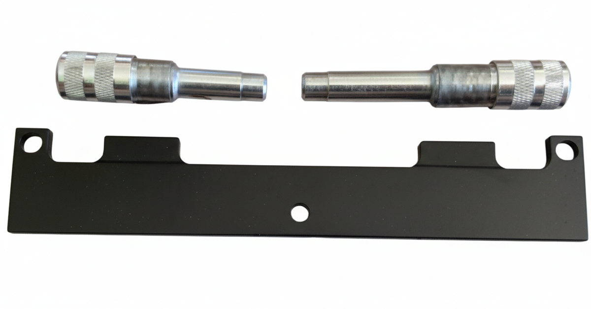 Juego profesional de puesta a punto y sincronización BGS 8215, compuesto por 3 piezas, diseñado para alinear y bloquear el cigüeñal y el árbol de levas en motores Ford a gasolina durante trabajos de mantenimiento, como el cambio de la banda/correa de distribución. Mantiene el motor en el punto exacto para evitar desplazamientos durante el ajuste.