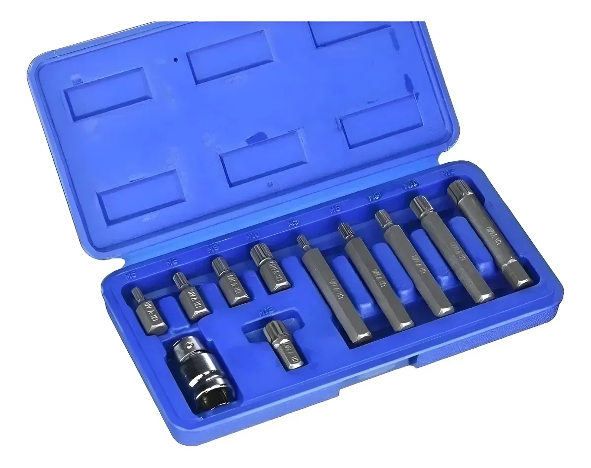 Juego profesional de puntas multiestria (spline) diseñado para trabajos de mecánica automotriz, motores, transmisiones y tareas de alta precisión donde se requiere un ajuste firme y seguro.