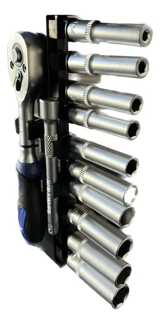 Incluye llave crique, alargue y la gama completa de medidas métricas más utilizadas en tareas de servicio, armado y mantenimiento.
