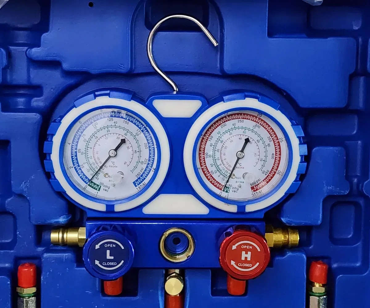 Equipado con doble manómetro, permite medir alta y baja presión con precisión dentro del rango de 600 psi a 3000 psi, asegurando un trabajo seguro y confiable.