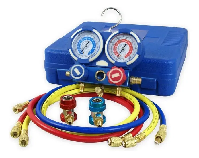 Manifold profesional para diagnóstico, carga y control de presión en sistemas de refrigeración que operan con gas R134a.