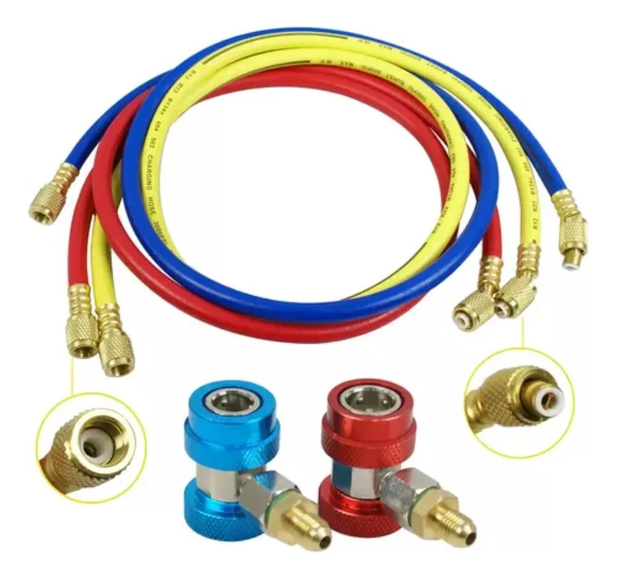 Incluye mangueras y acoples, permitiendo conectar directamente a sistemas de aire acondicionado automotriz, equipos de refrigeración doméstica (como heladeras) y otros sistemas compatibles con R134a.